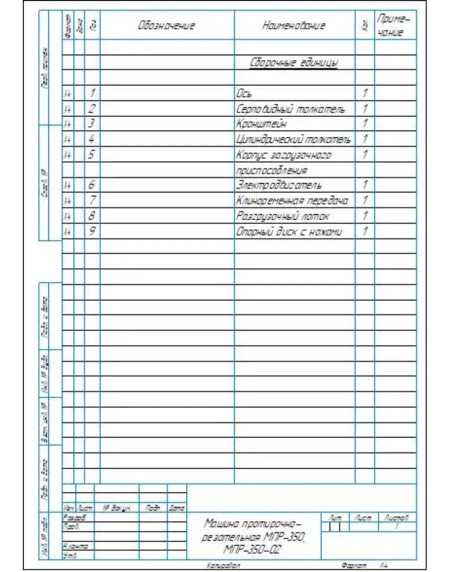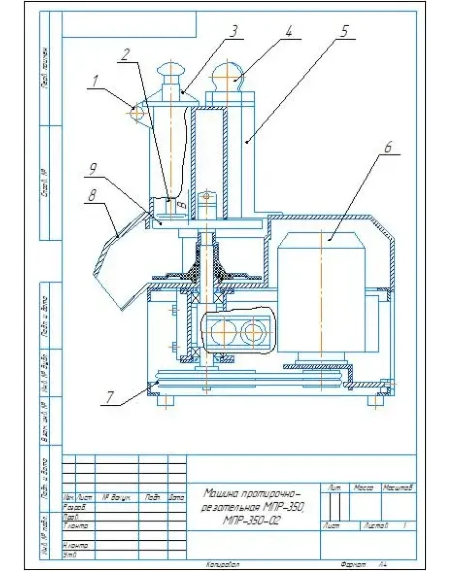 Сборочный чертеж и спецификация машины протирочно-резательной модели МПР-350, МПР-350-02. Чертеж и спецификация выполнены в программе Компас
