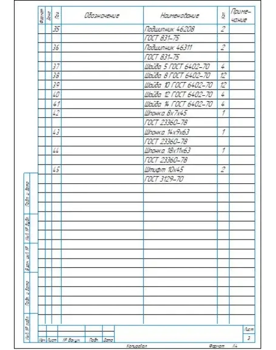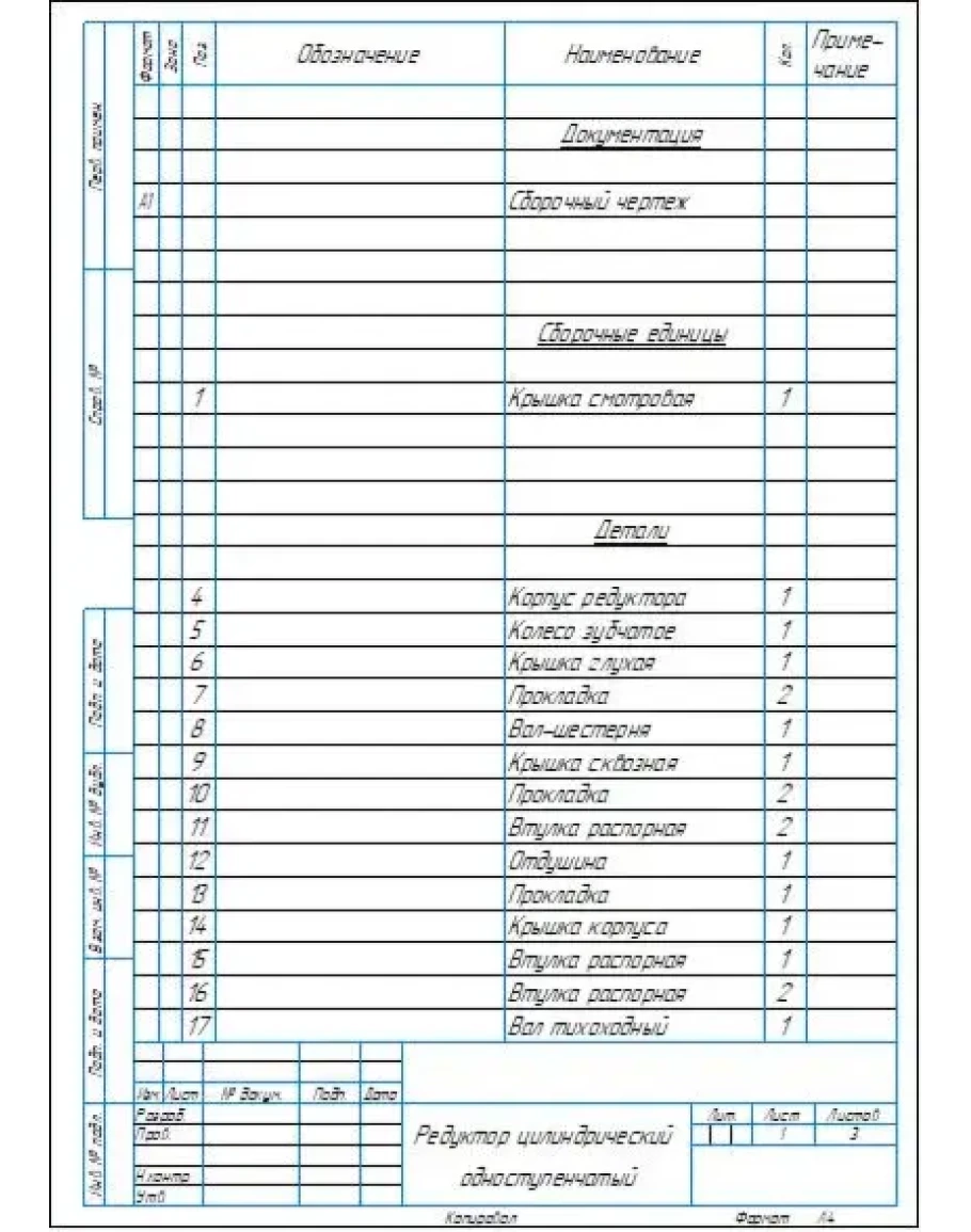 Сборочный чертеж и спецификация редуктора цилиндрического одноступенчатого вертикального с параметрами: модуль m=2 мм, передаточное отношение u=6,3, межосевое расстояние a=160 мм. Чертеж и спецификация выполнены в компасе