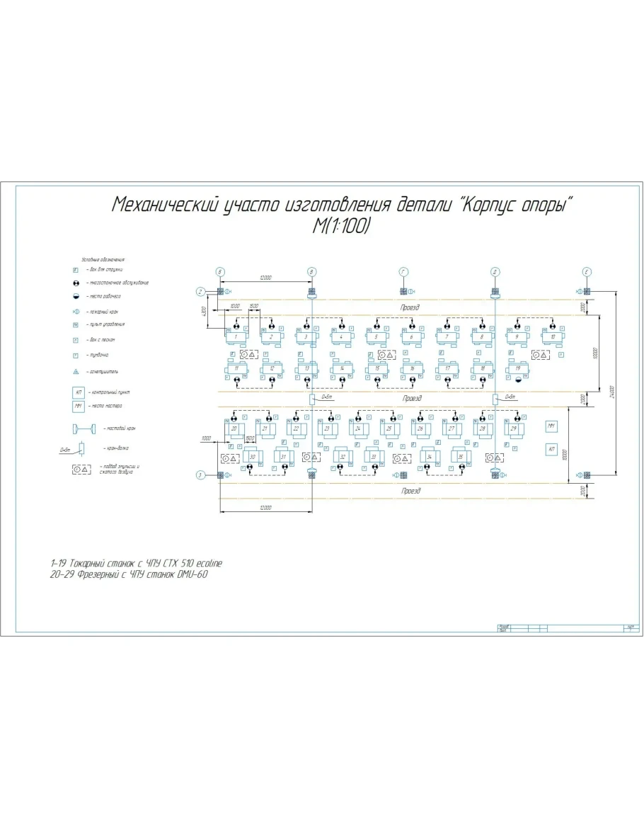 Чертеж планировки механического участка обработки детали "Корпус опоры" в программе Компас 3D