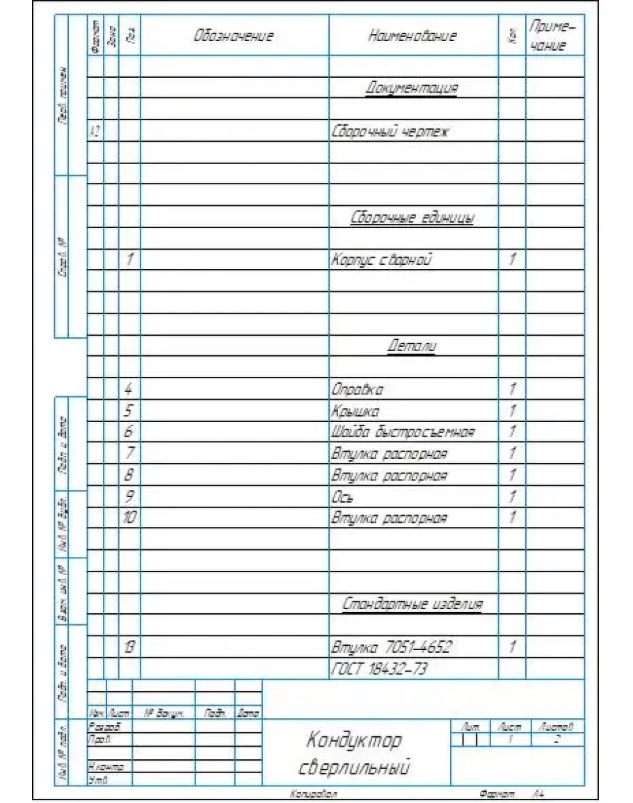 Сборочный чертеж и спецификация приспособления кондуктор сверлильный для сверления периферийных отверстий в трубчатой детали
