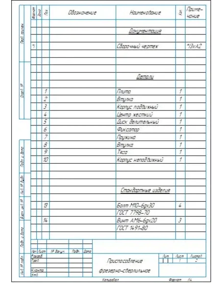 Сборочный чертеж и спецификация станочного фрезерного приспособления с делительным устройством для обработки детали типа вал. Чертеж и спецификация выполнены в компасе.