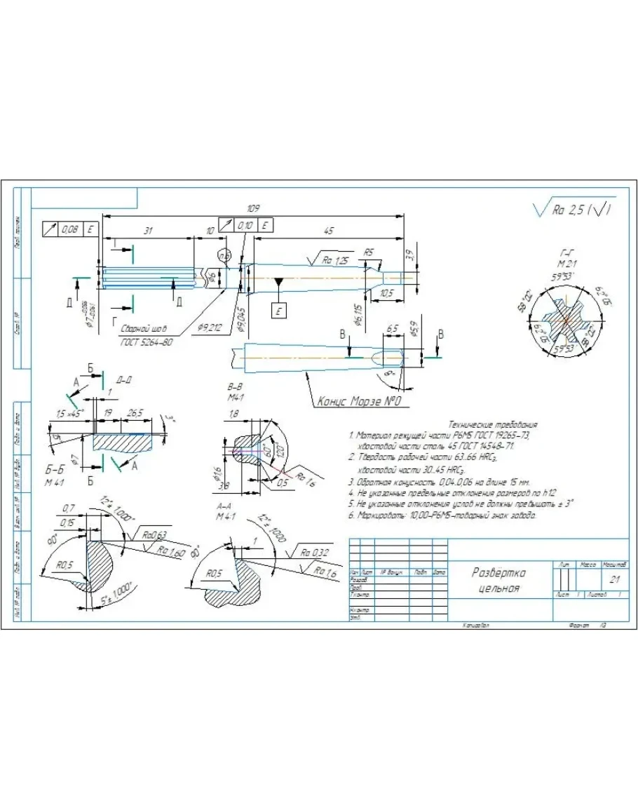 Чертеж развертка с коническим хвостовиком диаметр 7 мм