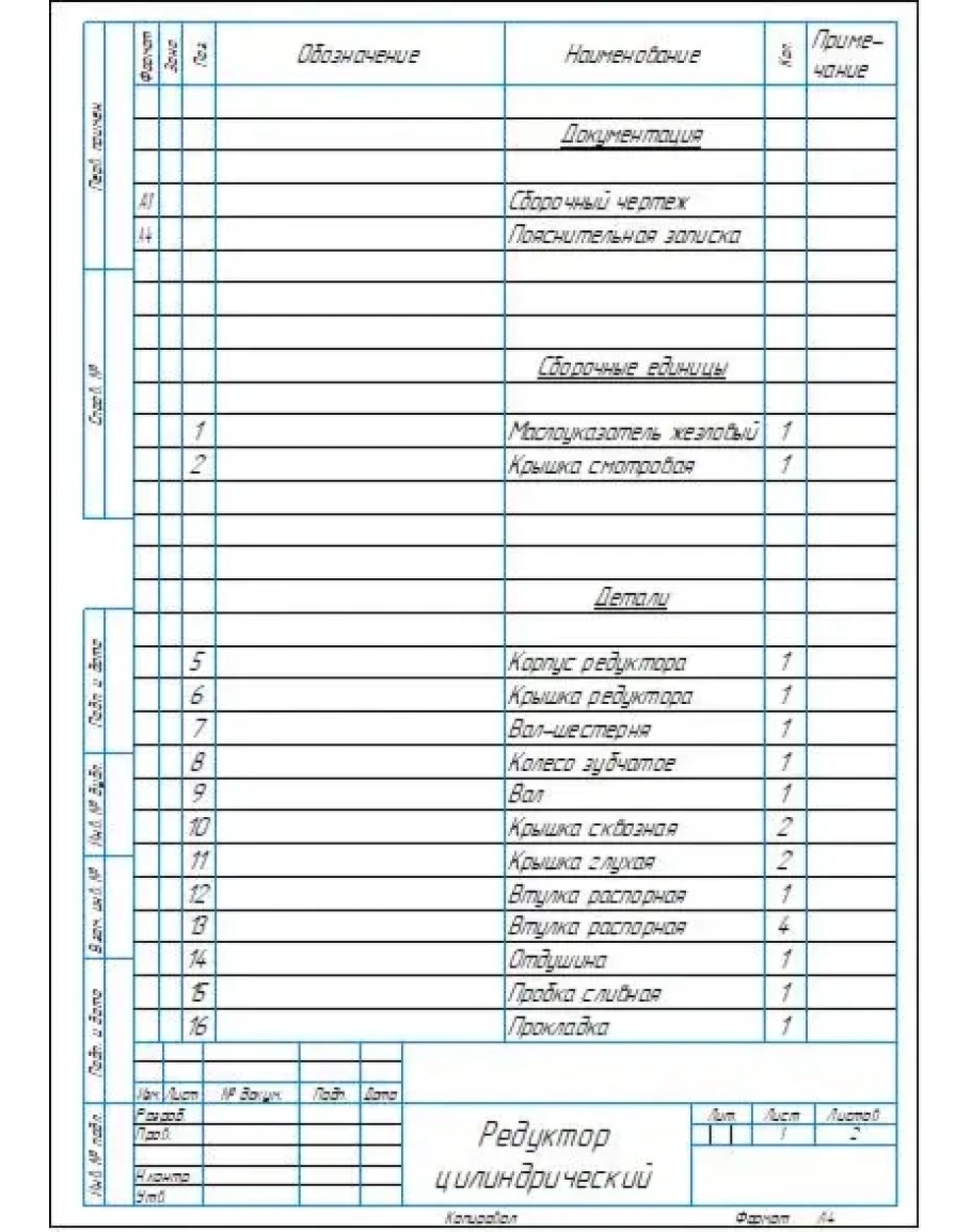 Сборочный чертеж и спецификация редуктора цилиндрического одноступенчатого с параметрами: модуль m=2 мм, межосевое расстояние a=150 мм, передаточное отношение u=5. Чертеж и спецификация выполнены в компасе.
