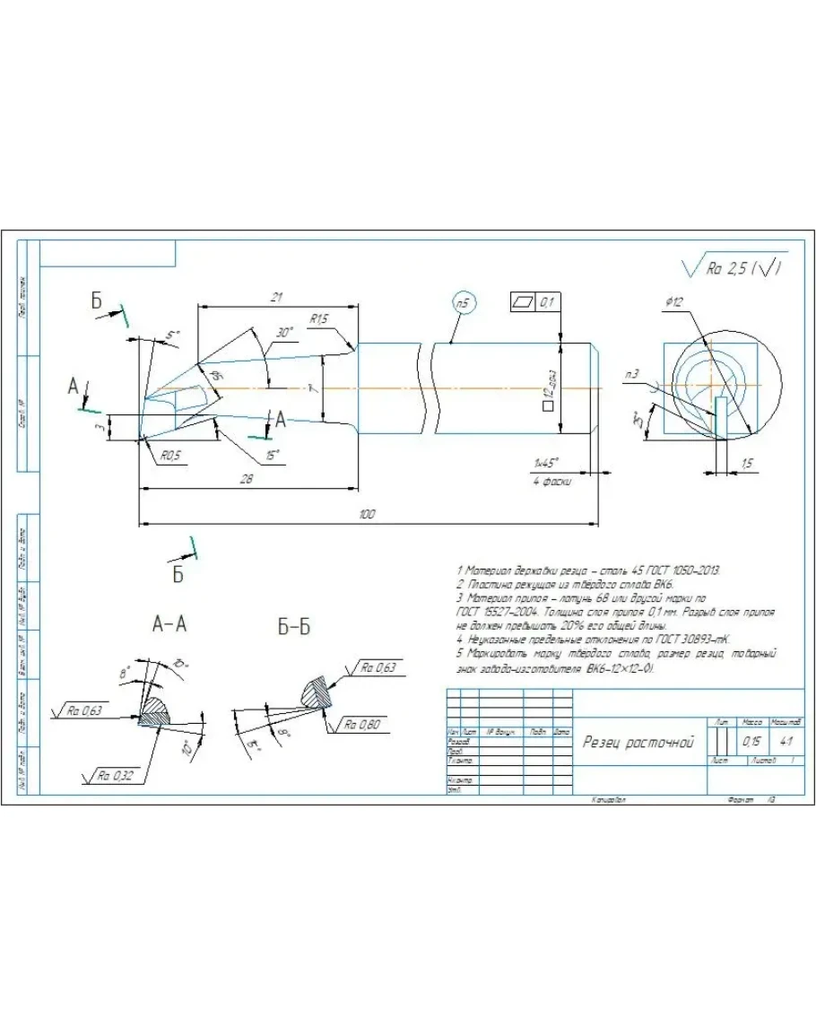 Чертеж резца токарного расточного с напайной режущей пластинкой для обработки глухих отверстий. Чертеж выполнен в компасе