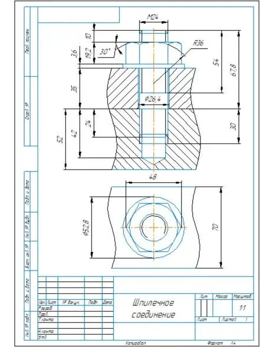 Чертеж шпилечного соединения с резьбой М24 в программе Компас 3D