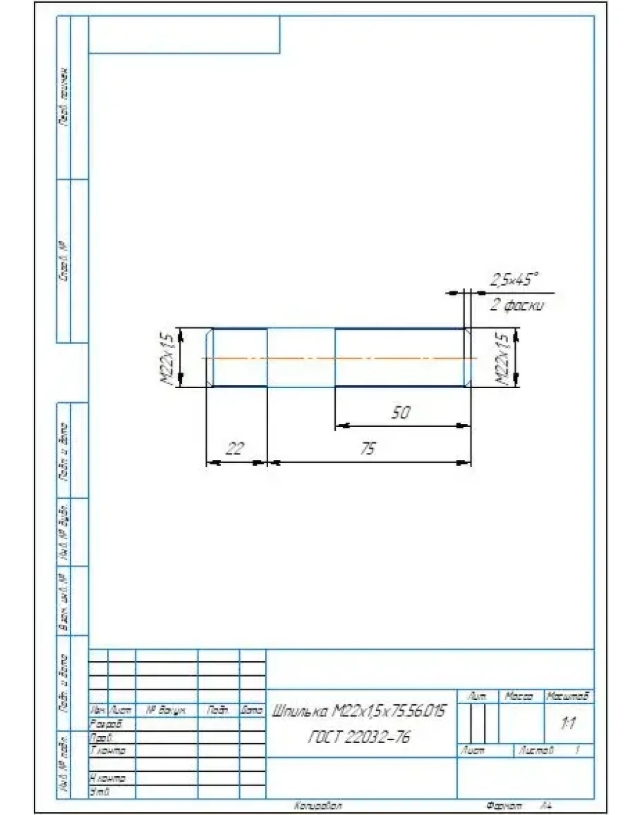 Рабочий чертеж детали шпилька М22х1,5х75 ГОСТ 22032-76 в программе Компас 3D