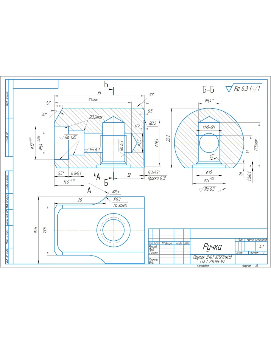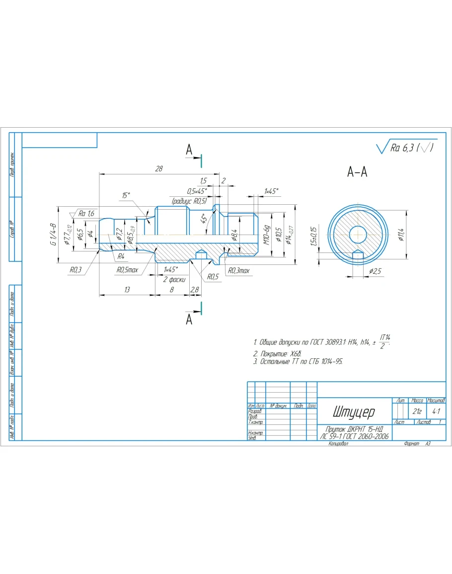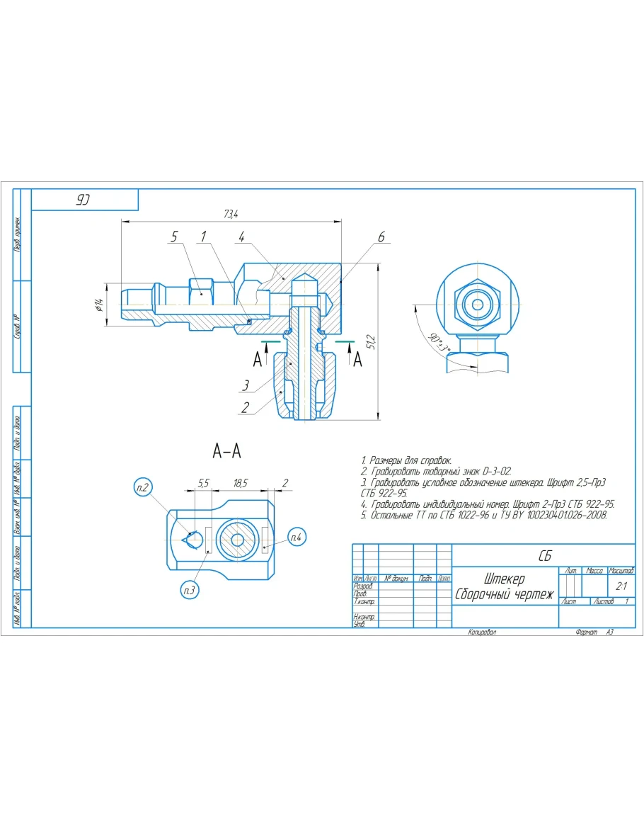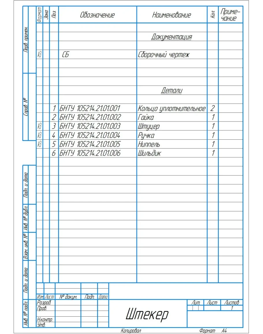 Сборочный чертеж, спецификация, а также рабочие чертежи некоторых деталей штекера для газообразных сред. Выполнено в Компас версии 20.