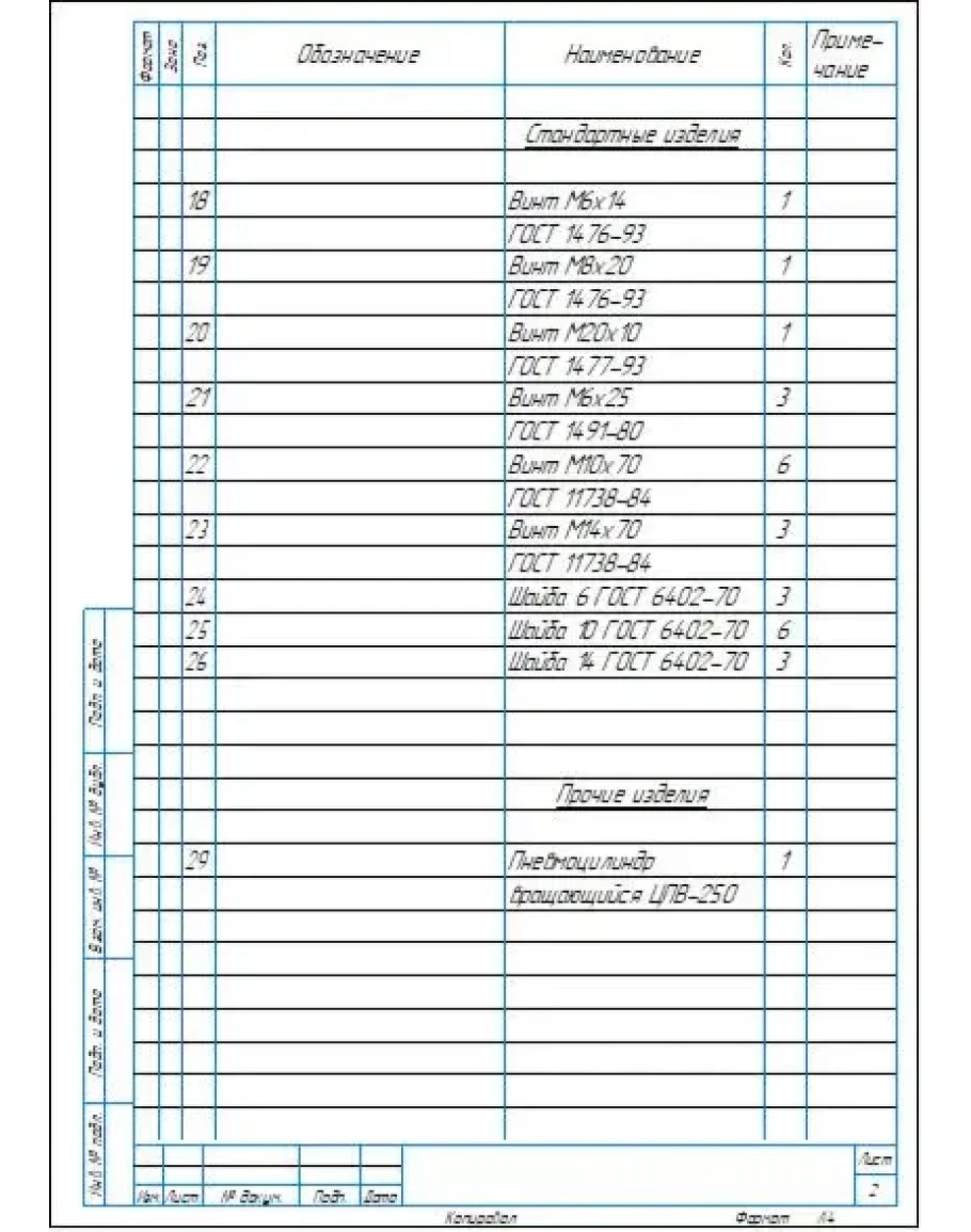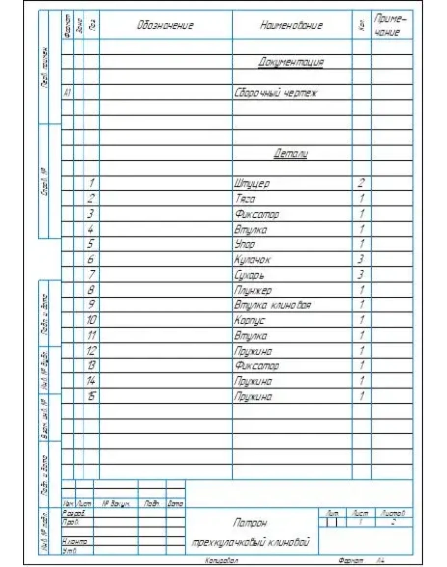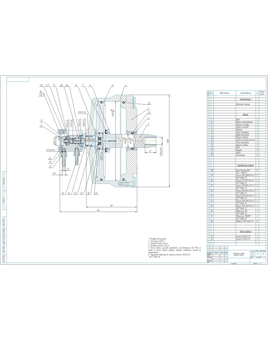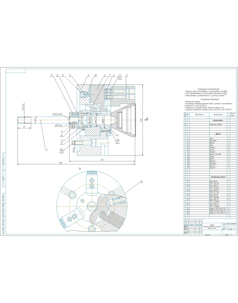 Сборочный чертеж со спецификацией патрона трехкулачкового клинового в программе компас. Диаметр патрона 250 мм. Также приложен сборочный чертеж пневмоцилиндра вращающегося для патрона диаметром 250 мм. Спецификации совмещены со сборочными чертежами