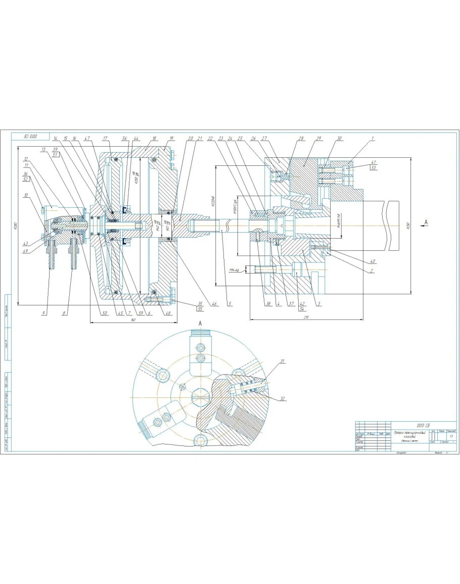 Сборочный чертеж и спецификация на трехкулачковый клиноплунжерный патрон с пневматическим приводом диаметром 250 мм в компасе