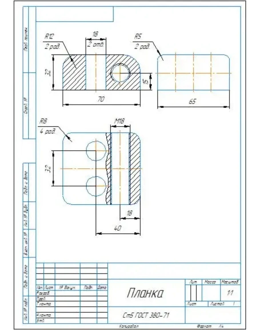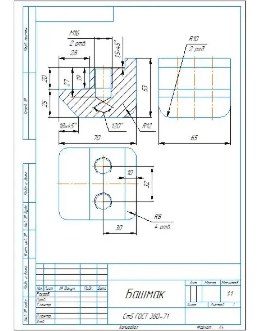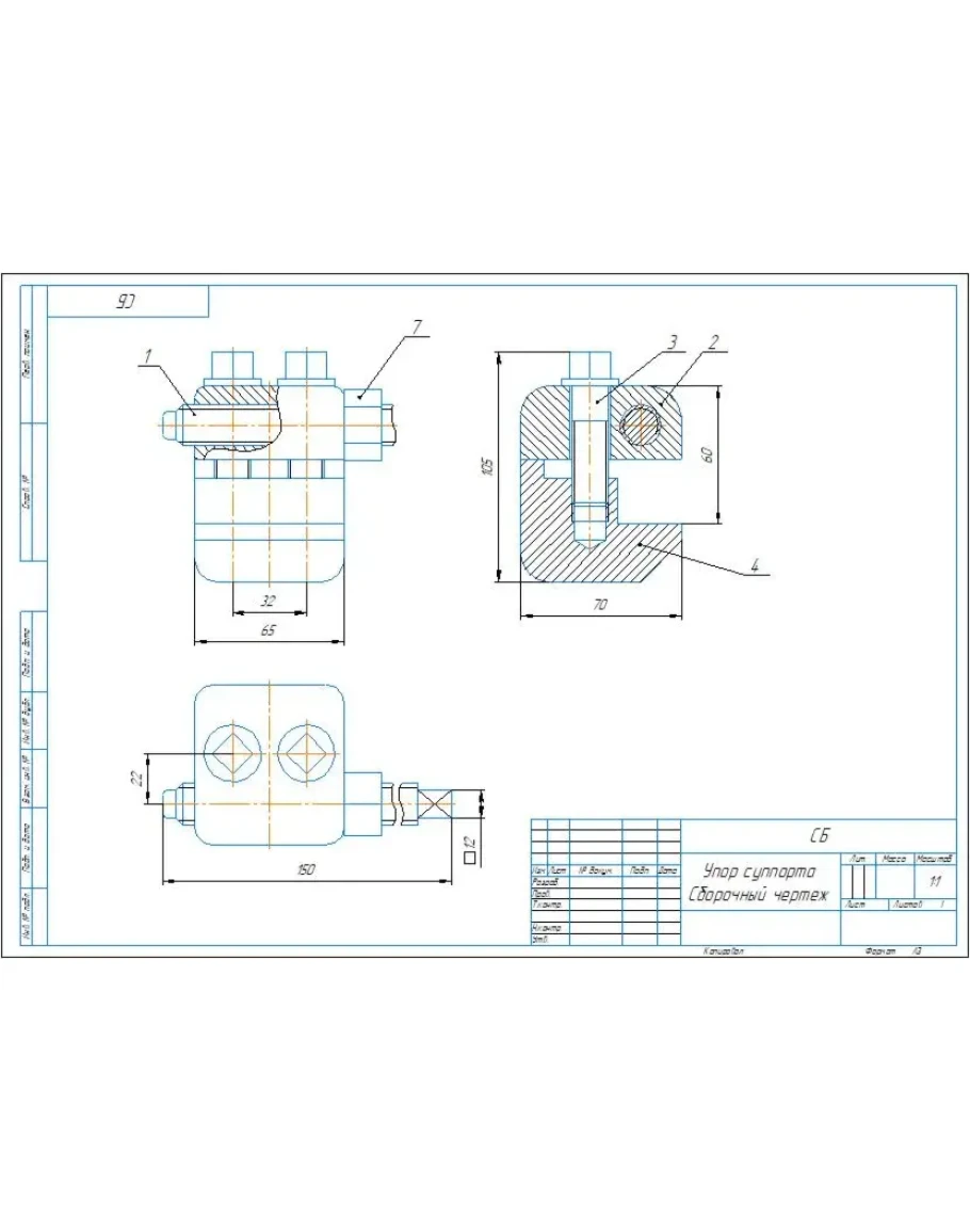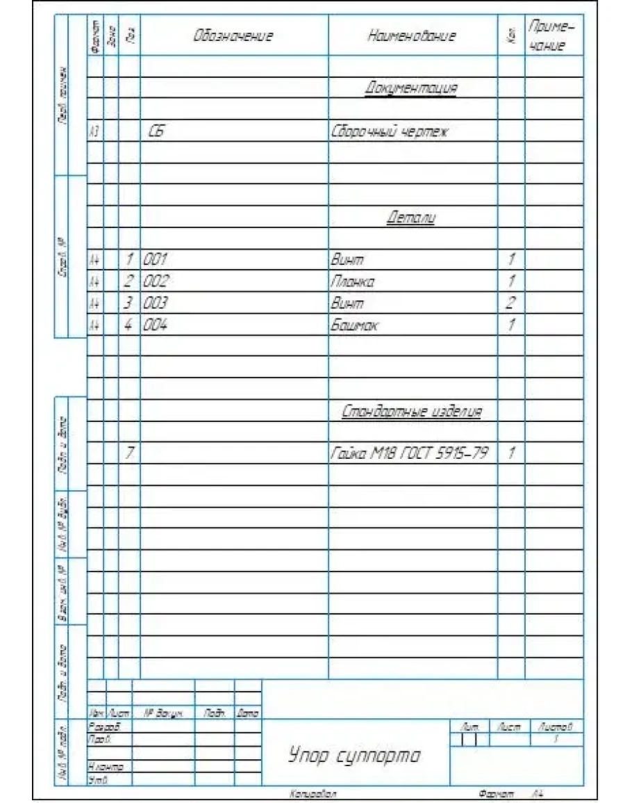 Сборочный чертеж и спецификация изделия упор суппорта.