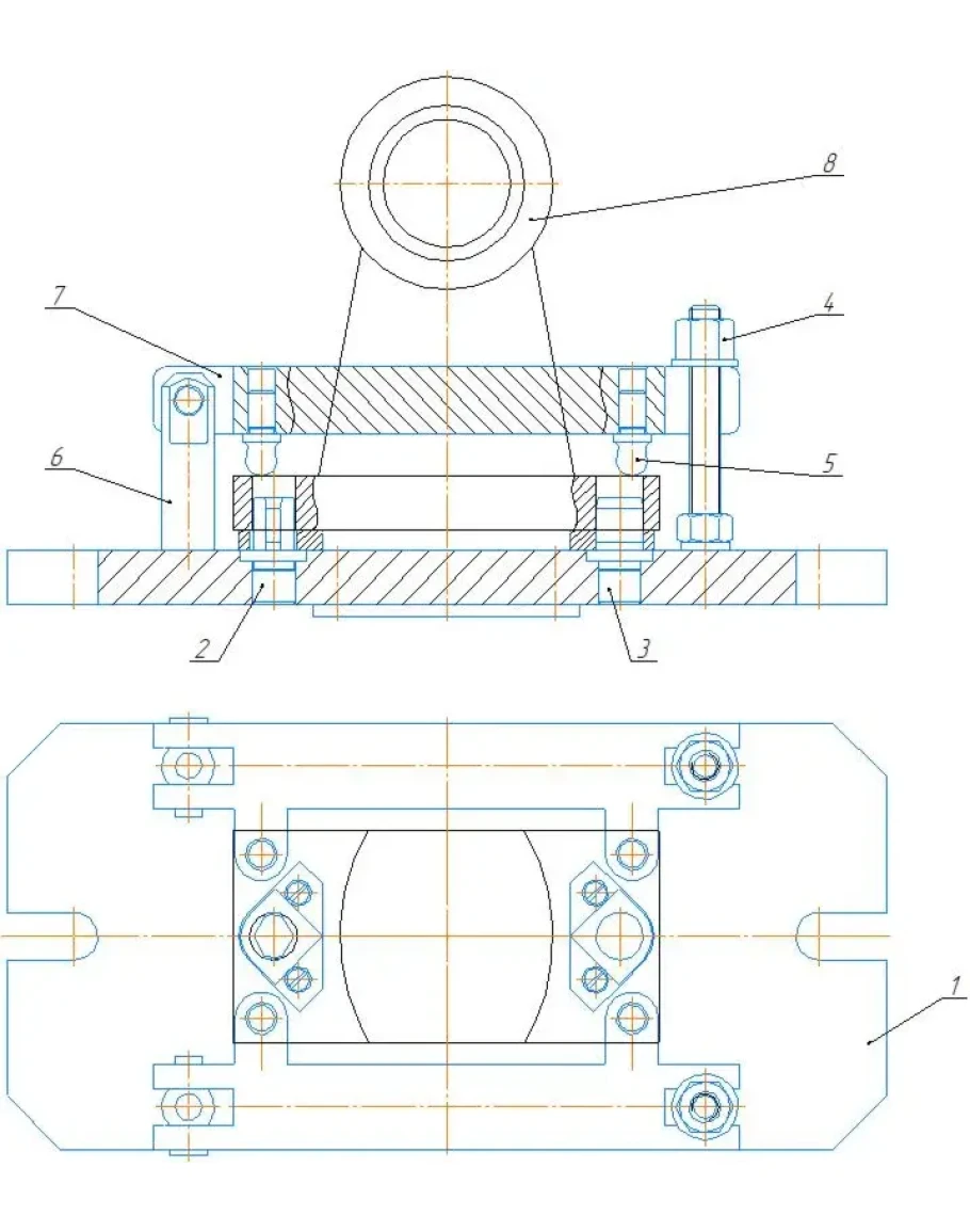 Эскиз приспособления для установки корпусной детали (кронштейн) по двум пальцам (цилиндрический и срезанный). Эскиз выполнен в компасе