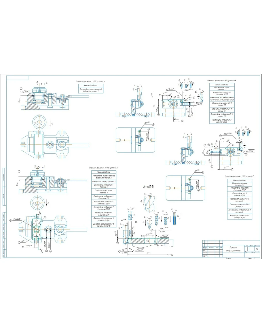 Эскизы операционные обработки детали плита в тисках эксцентриковых и оправке. Чертеж выполнен на формате А1, в программе компас. Также приложен рабочий чертеж детали плита в компасе.