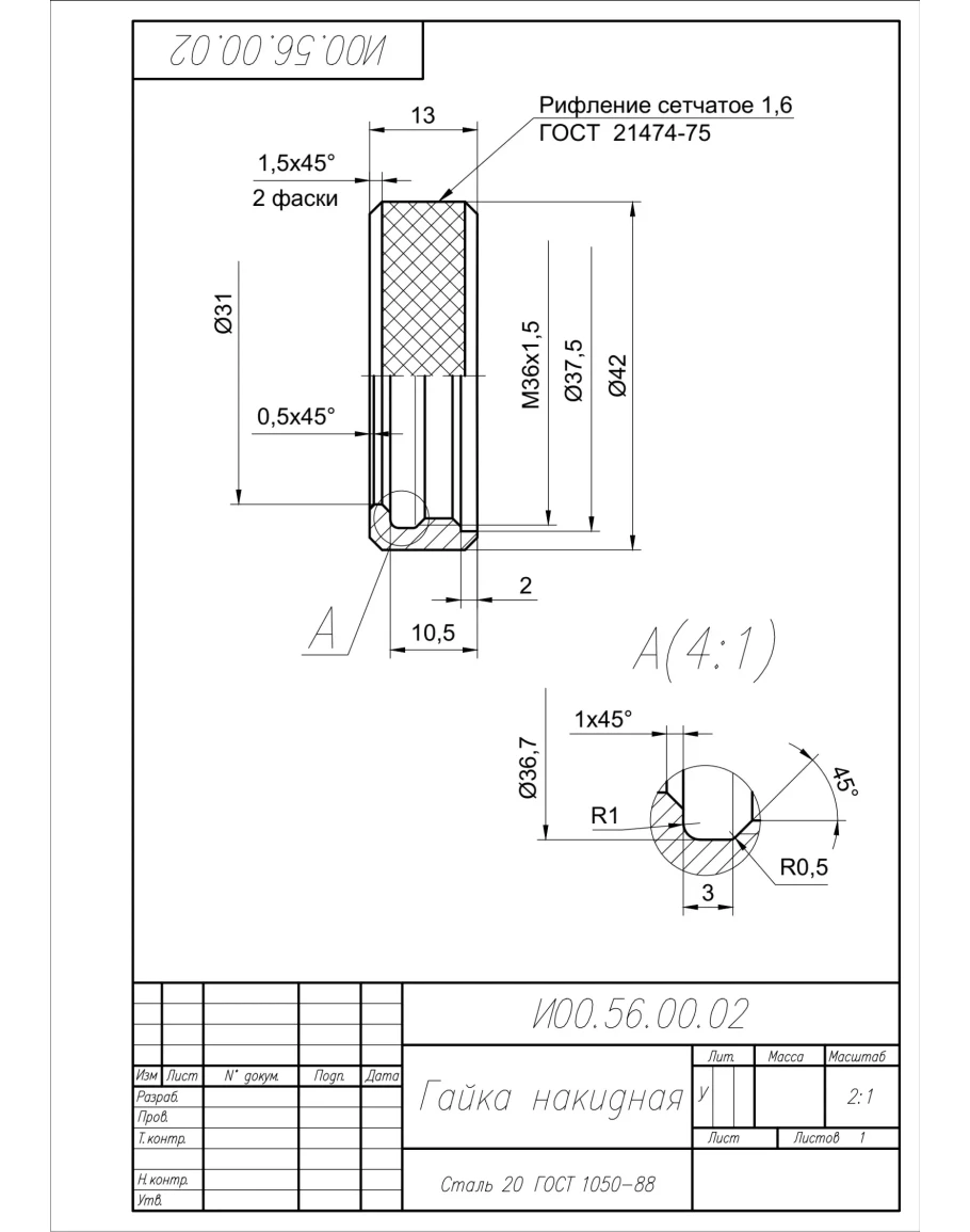 Рабочий чертеж детали гайка накидная И00.56.00.02 из сборки И00.56.00.00 маслораспылитель двойного распыления. Чертеж выполнен в программе AutoCAD
