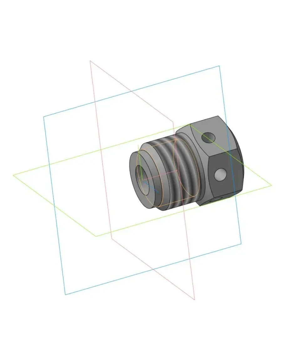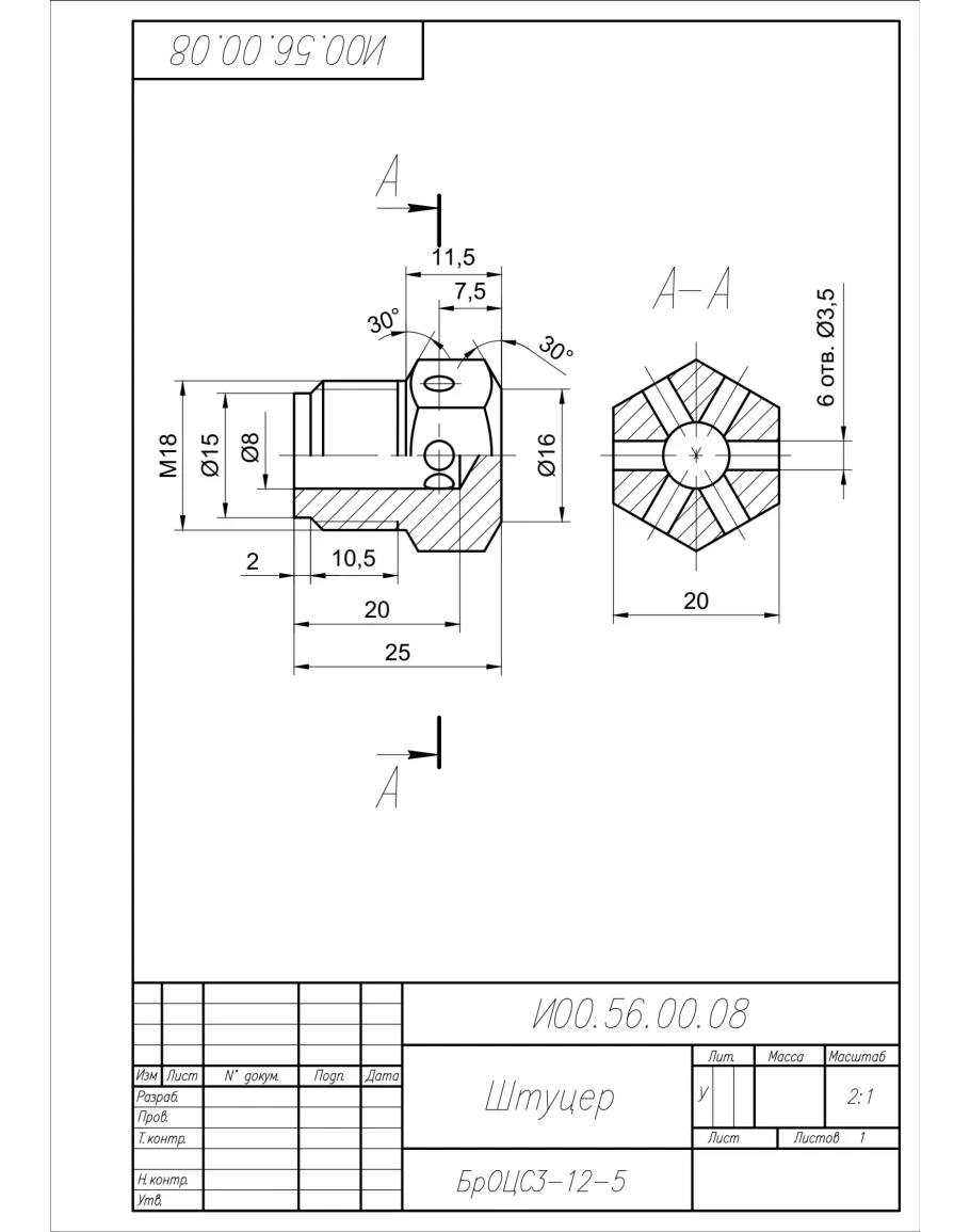 Рабочий чертеж и 3D-модель детали штуцер И00.56.00.08 из сборки И00.56.00.00 маслораспылитель двойного распыления. Чертеж выполнен в программе AutoCAD, 3D модель выполнена в программе Компас 3D