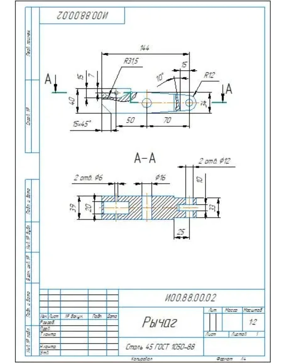 Рабочий чертеж детали рычаг И00.88.00.02 из сборки И00.88.00.00 приспособление для захвата прутков 19. Чертеж выполнен в программе Компас 3D