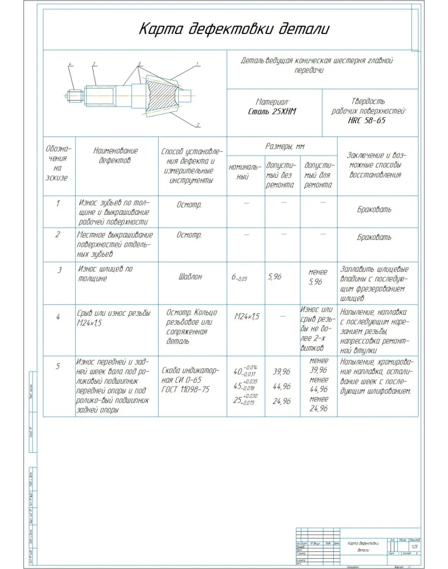 Карта дефектации шестерни главной передачи КамАЗ 65117