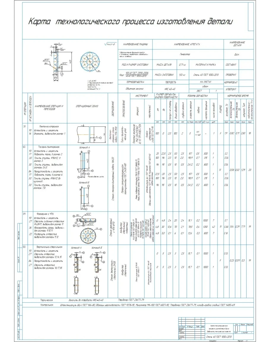 Карта технологического процесса изготовления детали диск в компасе, на формате А1. В карте представлены: рабочий чертеж детали диск, перечень операций и переходов, оборудование, режущий и измерительный инструменты, режимы резания, нормы времени, операционные эскизы.