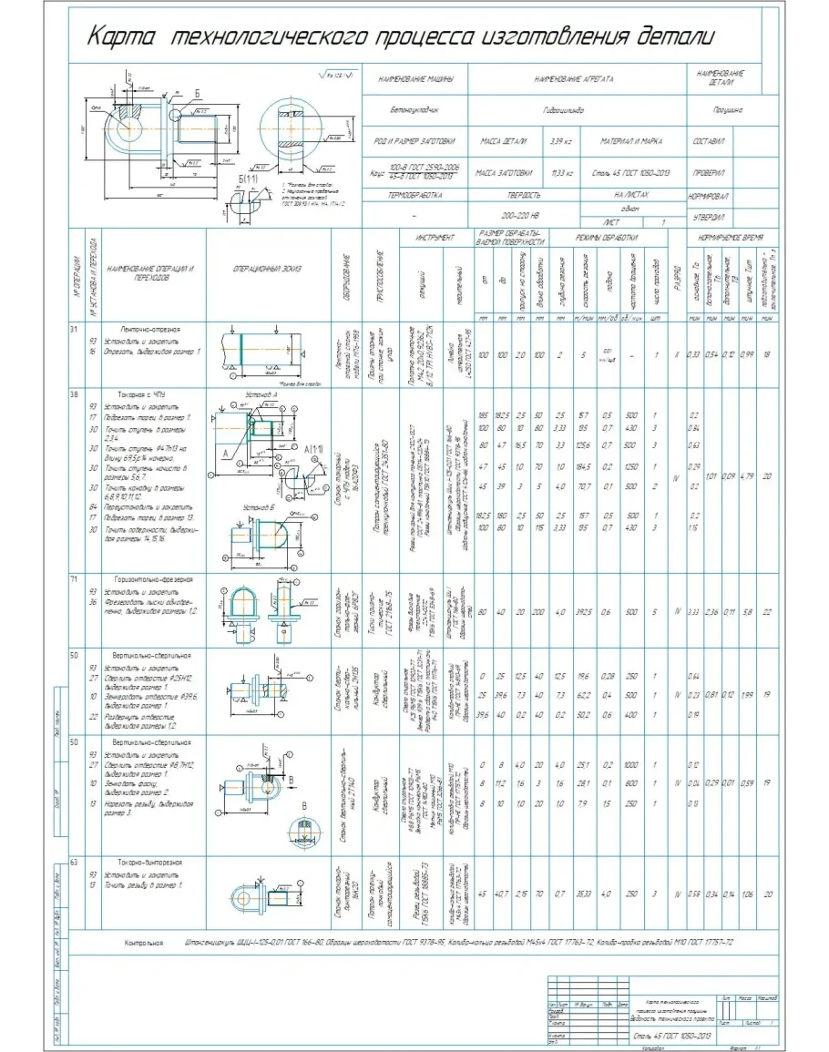 Карта технологического процесса изготовления детали проушина гидроцилиндра в виде чертежа на формате А1, выполненного в программе компас