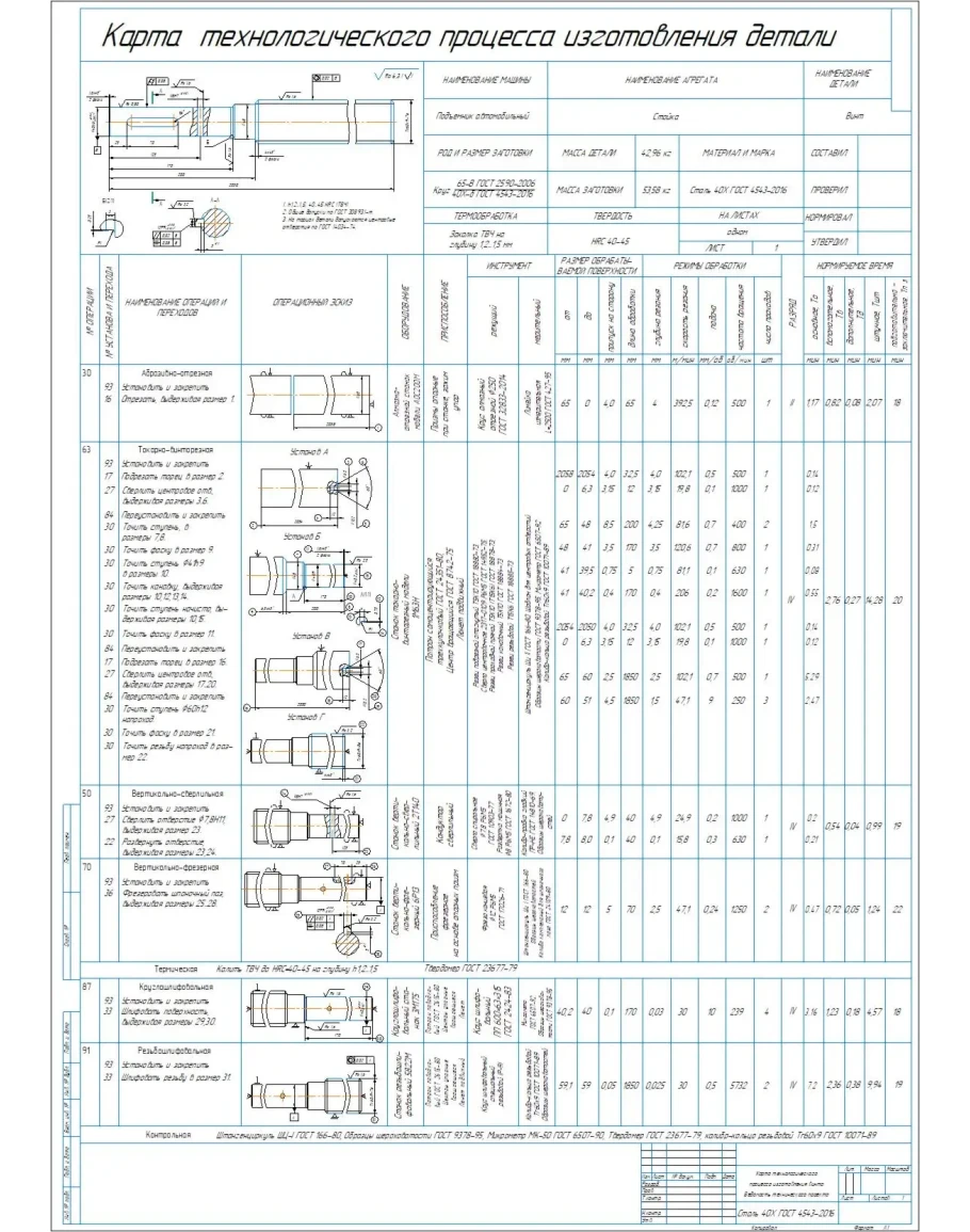 Карта технологического процесса изготовления детали винт подъемника автомобильного в компасе, на формате А1. В карте представлены: рабочий чертеж детали винт подъемника автомобильного, перечень операций и переходов, оборудование, режущий и измерительный инструменты, режимы резания, нормы времени, операционные эскизы.