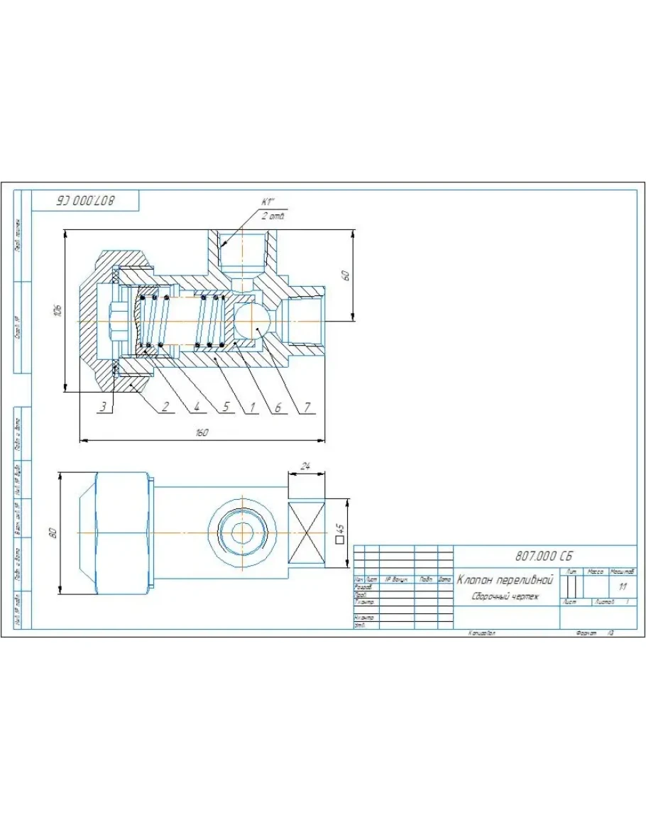 Сборочный чертеж сборки клапан переливной в программе Компас 3D
