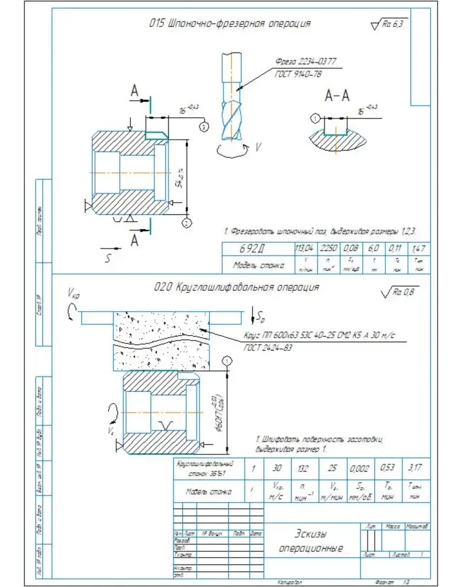 Рабочий чертеж детали кольцо, чертеж заготовки, чертеж токарно-револьверной наладки, операционные эскизы на шпоночно-фрезерную и шлифовальную операции. Технологический процесс изготовления детали кольцо в виде технологических карт: маршрутные карты, операционные карты (на 2 операции), карты эскизов (на 2 операции). Чертежи выполнены в компасе, карты в ворде.