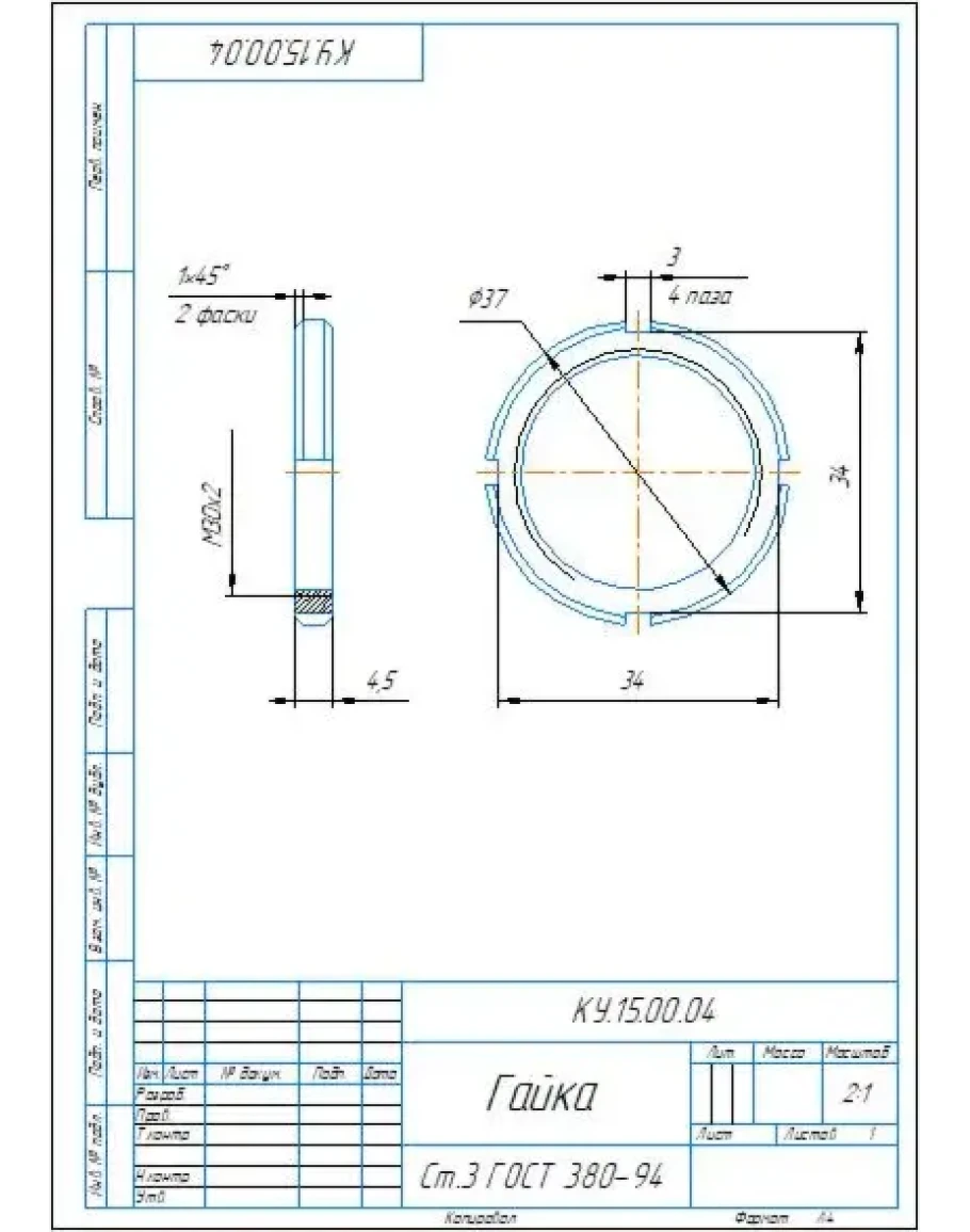 Рабочий чертеж детали гайка КУ.15.00.04 в программе Компас 3D