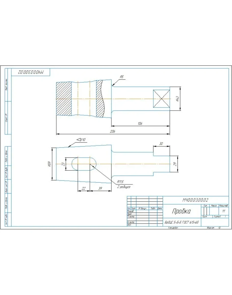 Рабочий чертеж детали пробка МЧ00.03.00.02 из сборки МЧ00.03.00.00 кран сливной из альбома по деталированию Боголюбова. Чертеж выполнен в программе Компас