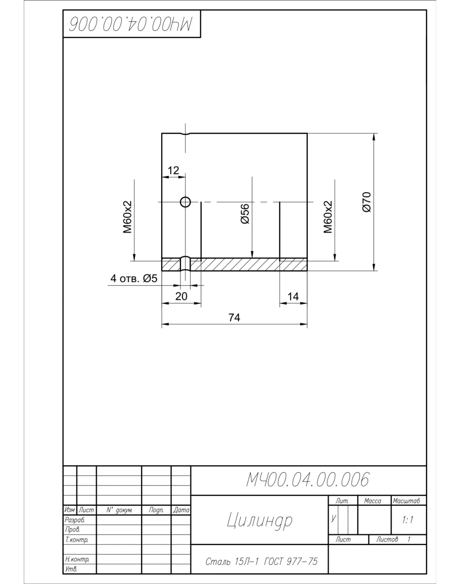 Рабочий чертеж детали цилиндр МЧ00.04.00.006 в программе AutoCAD