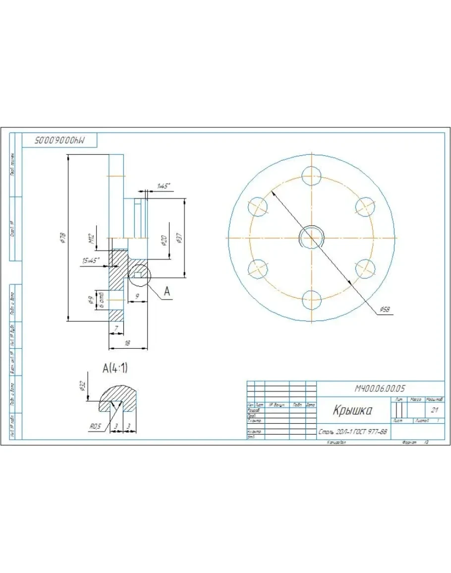 Рабочий чертеж детали крышка МЧ00.06.00.05 из сборки МЧ00.06.00.00 альбома по деталированию Боголюбова. Чертеж выполнен в Компасе