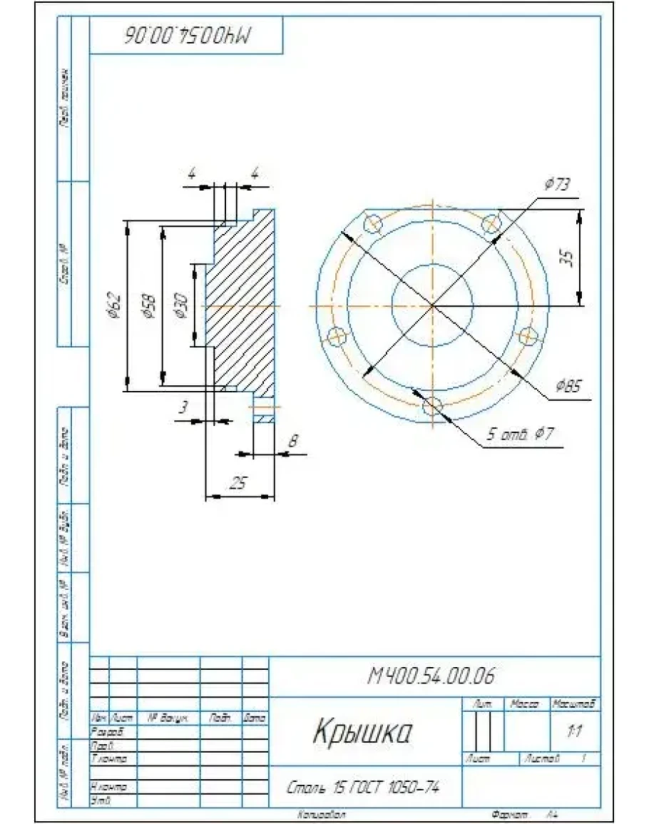 Рабочий чертеж детали крышка МЧ00.54.00.06 из альбома по деталированию Боголюбова в программе компас
