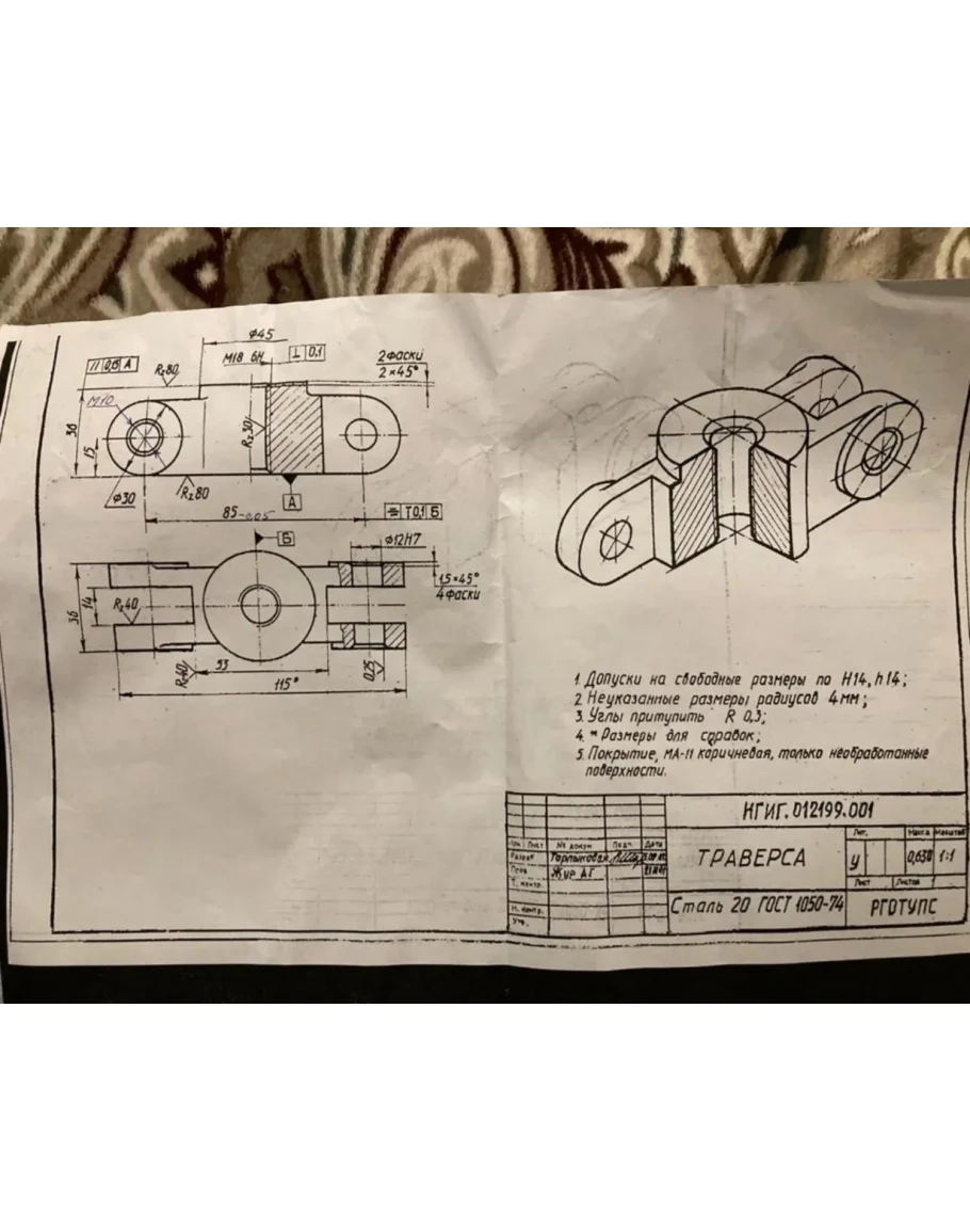 Твердотельная параметрическая модель детали траверса, выполненная в программе Компас-3D. Размеры детали указаны на картинке