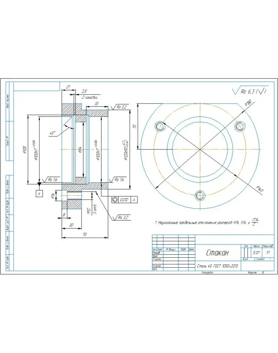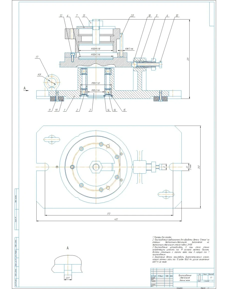 Сборочный чертеж и спецификация приспособления сверлильного делительного для обработки отверстий в детали стакан. Также приложен чертеж обрабатываемой детали - стакан. Чертежи и спецификация выполнены в компасе