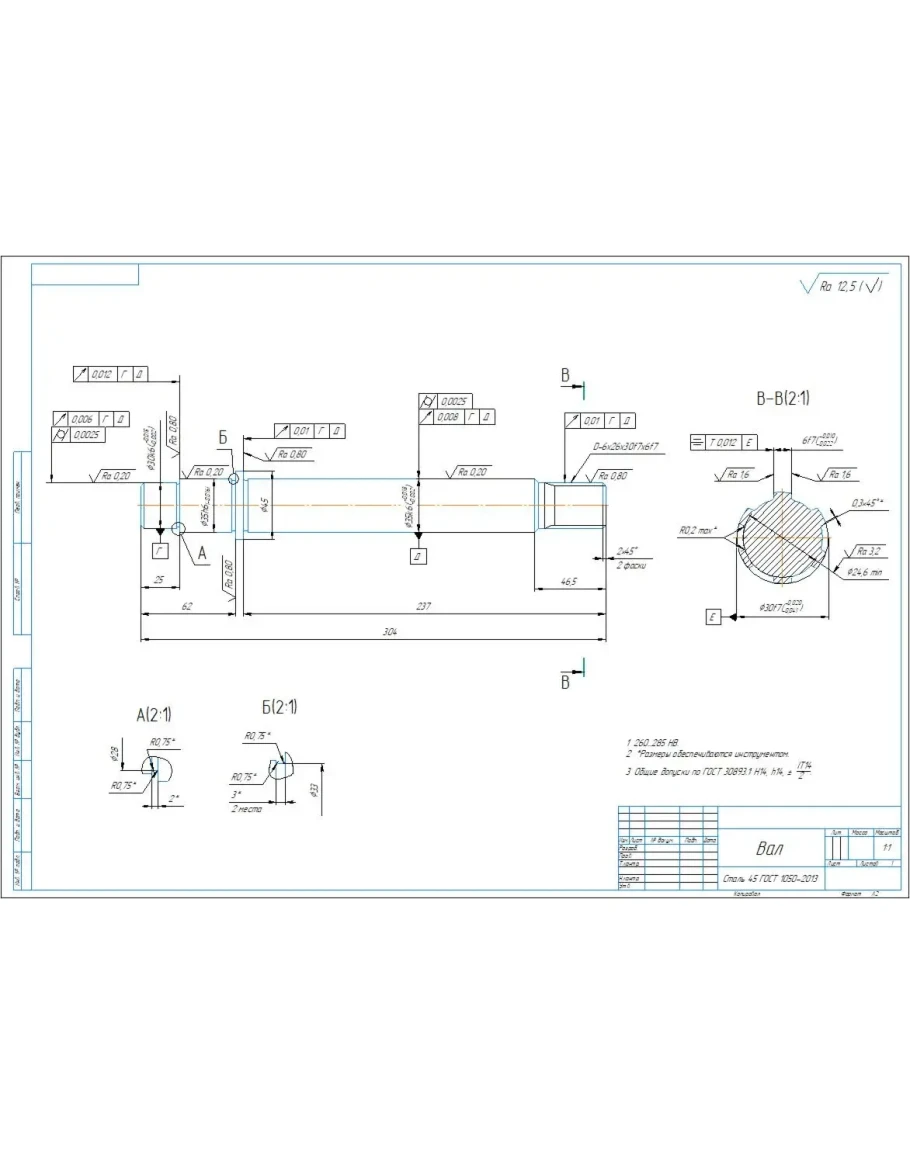 Рабочий чертеж детали вал с прямобочными шлицами в программе Компас 3D