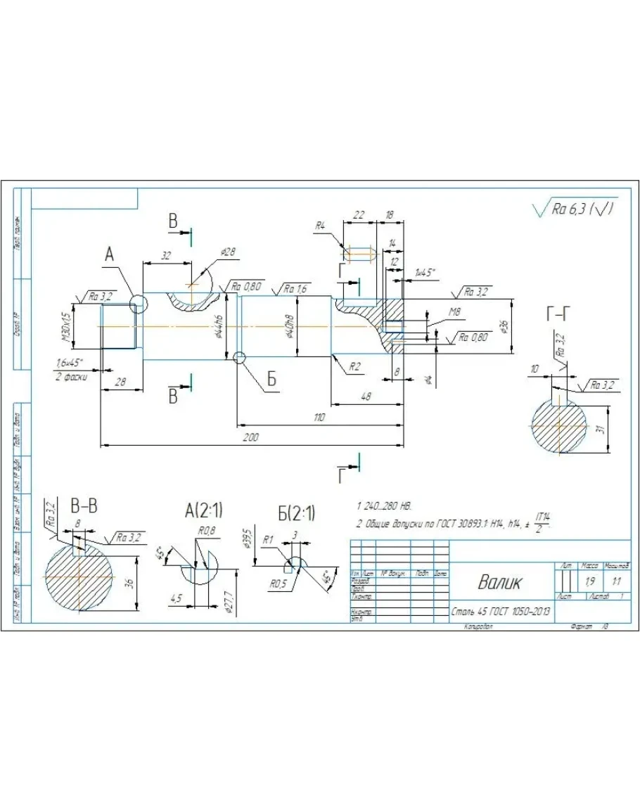 Рабочий чертеж детали "Валик" в программе Компас 3D
