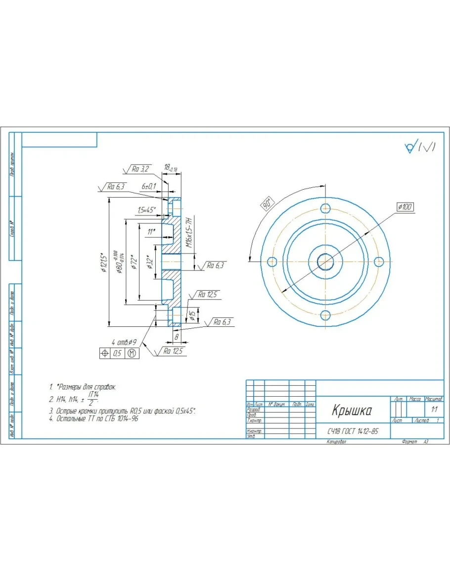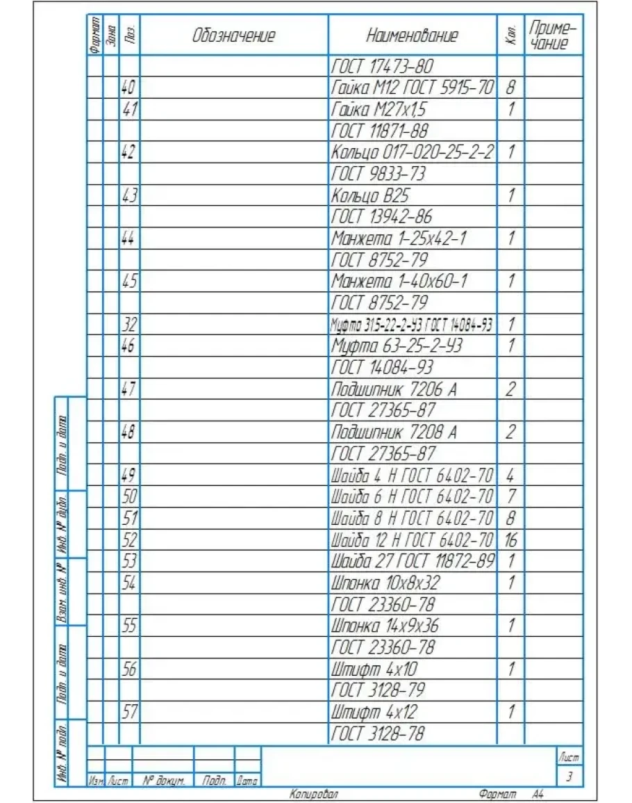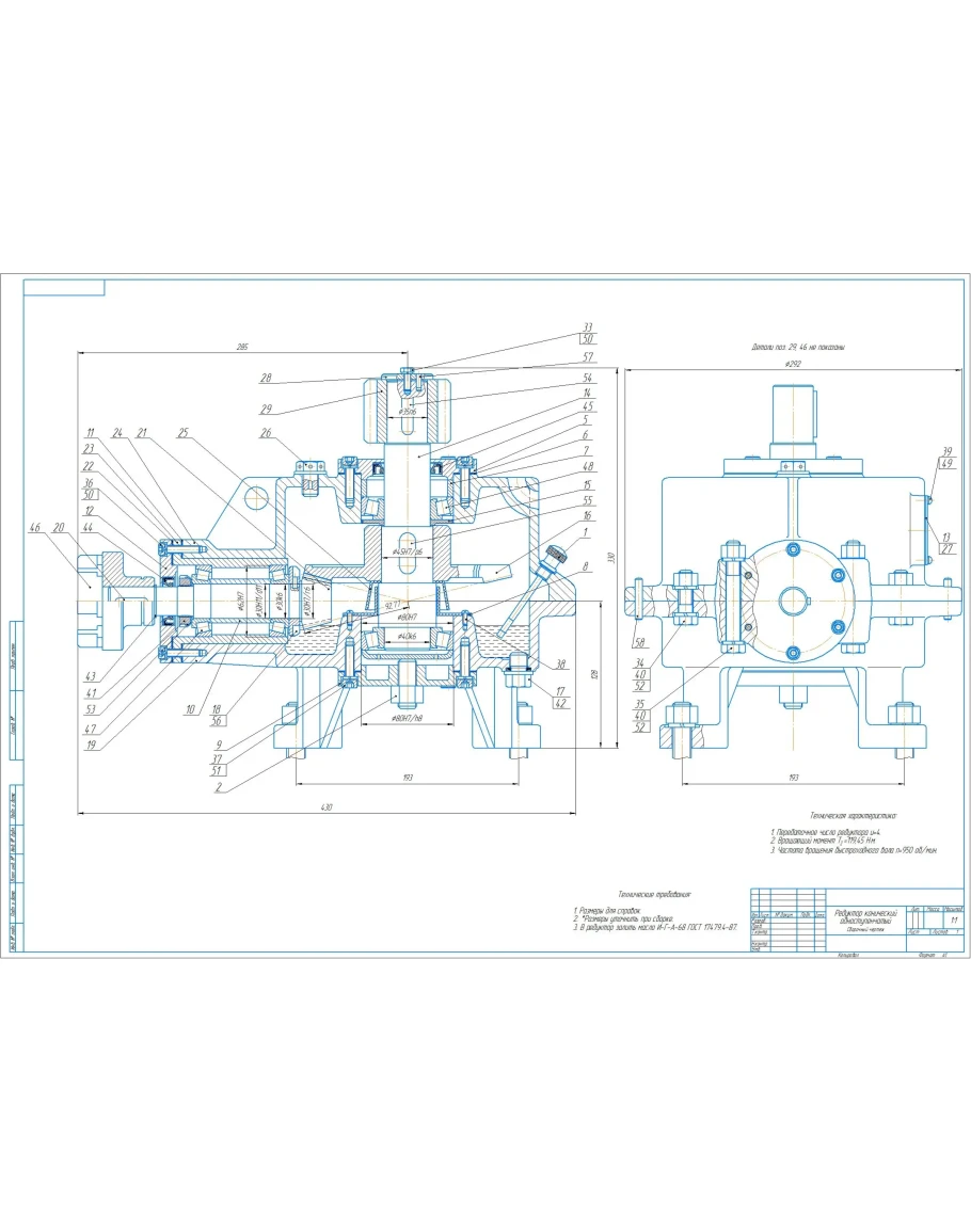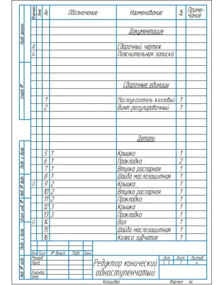 Сборочный чертеж и спецификация редуктора конического одноступенчатого вертикального в компасе, передаточное отношение равно 4. Также в архиве находятся чертеж крышки и вала. Все чертежи и спецификация выполнены в компасе.