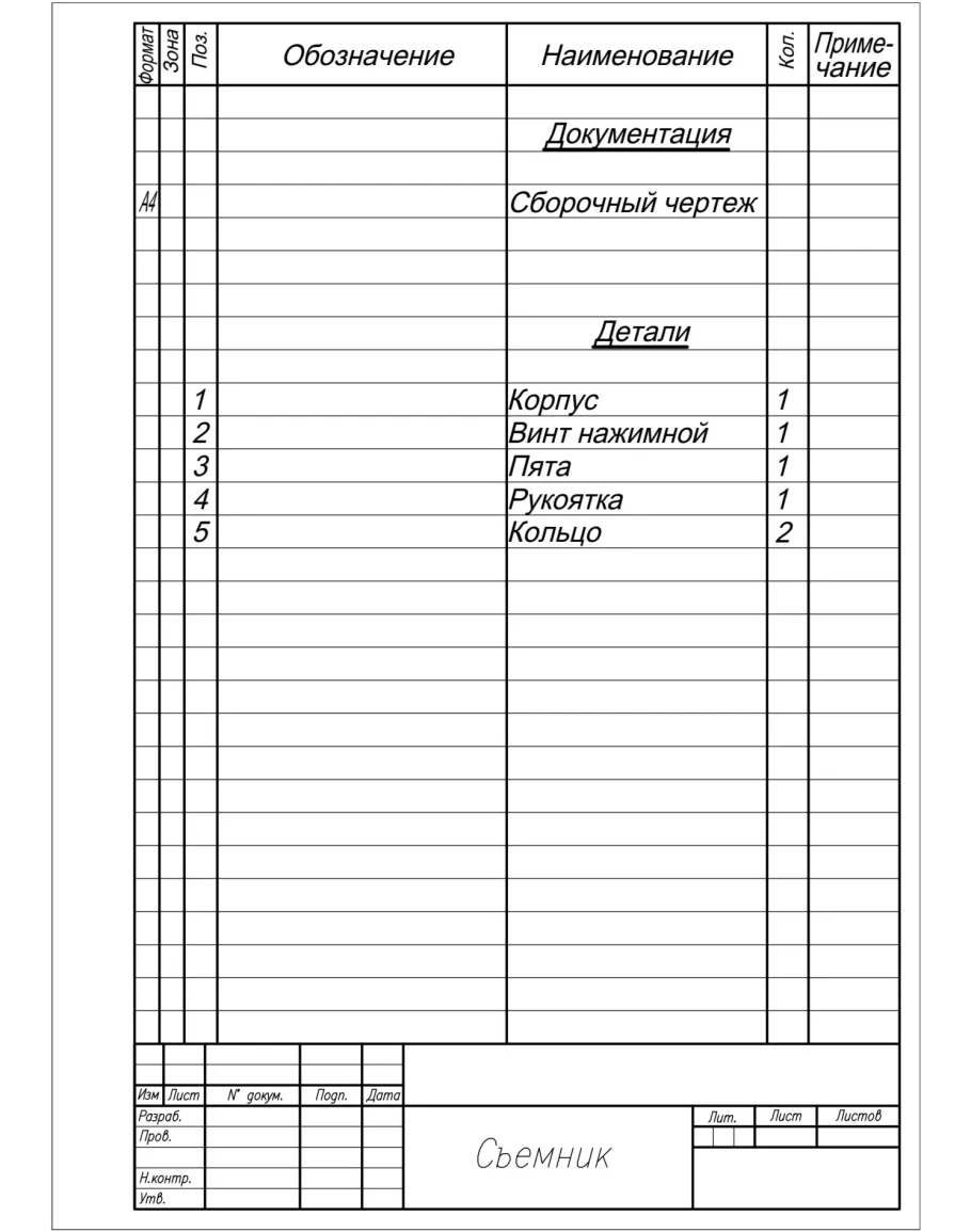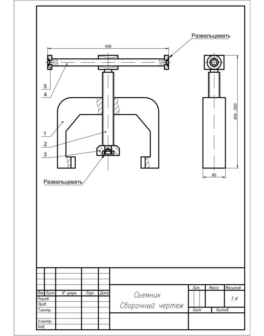 Съемник. Сборочный чертеж и спецификация