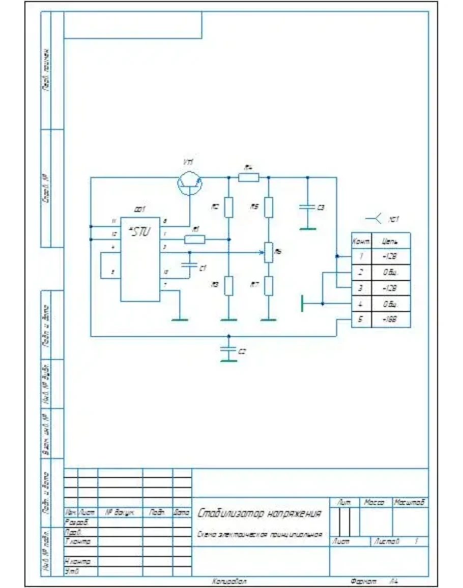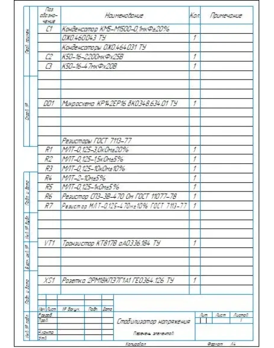 Схема электрическая и перечень элементов для стабилизатора напряжения в программе компас