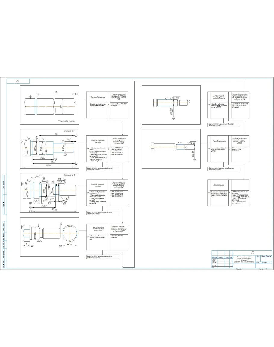 Схема технологического процесса изготовления детали ось на формате А1. На схеме указаны технологические операции, переходы, операционные эскизы, станок, режущий инструмент. Также приложен рабочий чертеж детали ось.