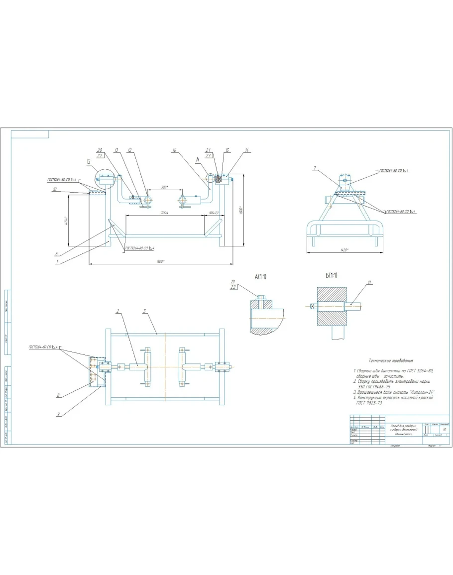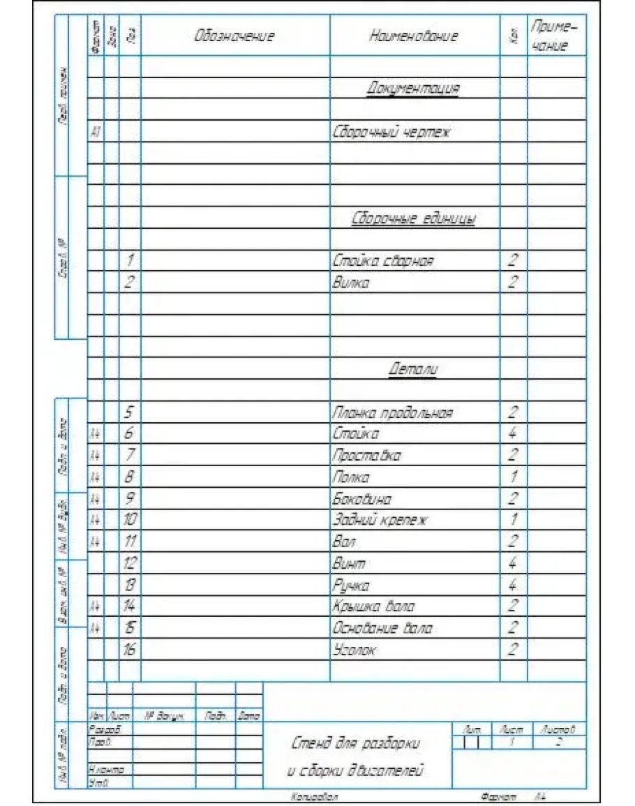 Сборочный чертеж и спецификация, а также некоторые чертежи деталей на стенд для разборки и сборки двигателей. Чертежи выполнены в Компасе