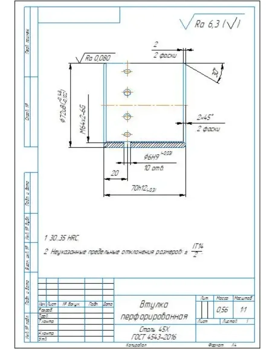 Маршрутные карты, операционные карты, карты эскизов, контрольная карта технологического процесса изготовления детали втулка перфорированная. Также приложен рабочий чертеж детали в компасе. Карты выполнены в ворде.