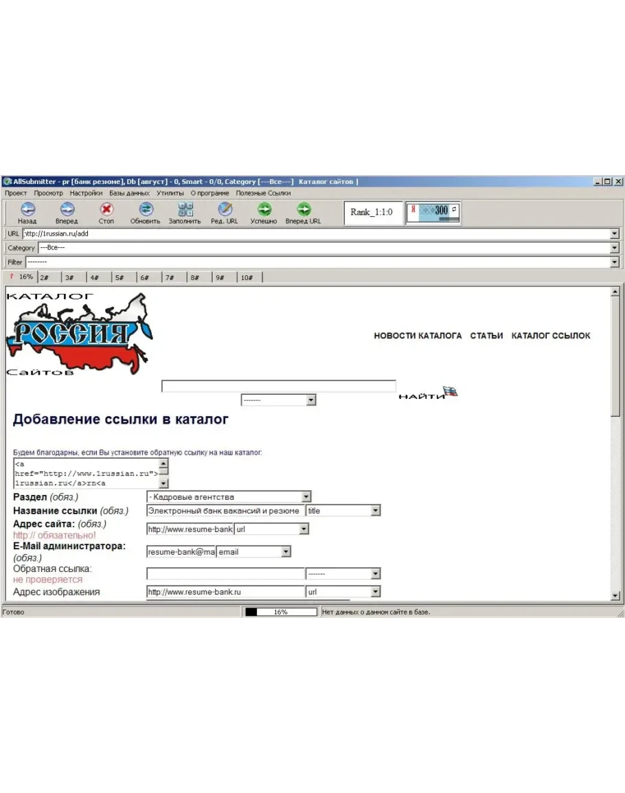 Полуавтоматическая и автоматическая регистрация, с 100% качеством в любых информационных ресурсах интернета. Максимально качественная, быстрая и контролируемая регистрация в любых информационных ресурсах Интернета (поисковые системы, каталоги, рейтинги, доски объявлений, shareware сайты, новостные ресурсы, обмен ссылками и.т.д. ).