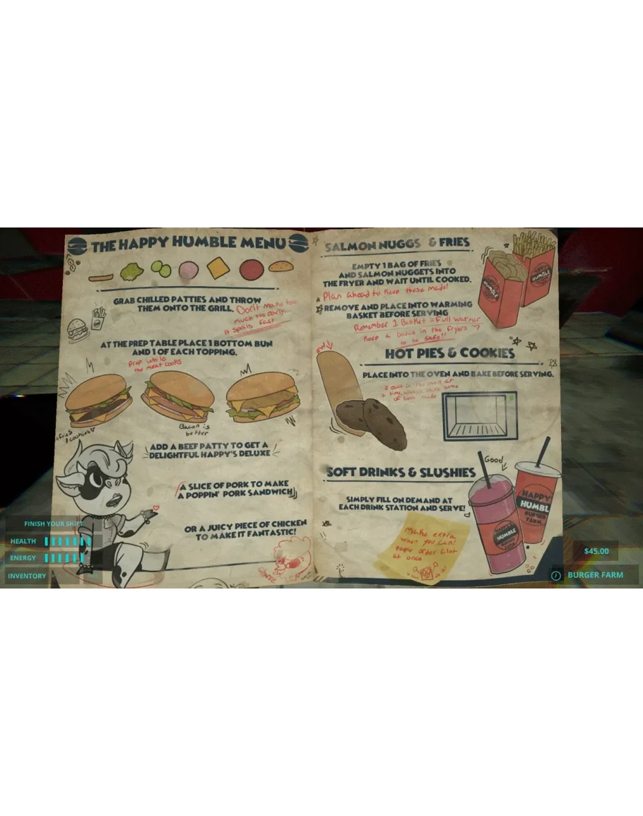 Ты будешь жарить котлетки, смотреть за фритюрницами и разливать напитки в тихом ресторанчике на окраине города. Посетителям ну очень нравится меню, и они просят еще вкуснейших сэндвичей Happy’s Deluxe, Fantastic Fowl и Poppin’ Pork.