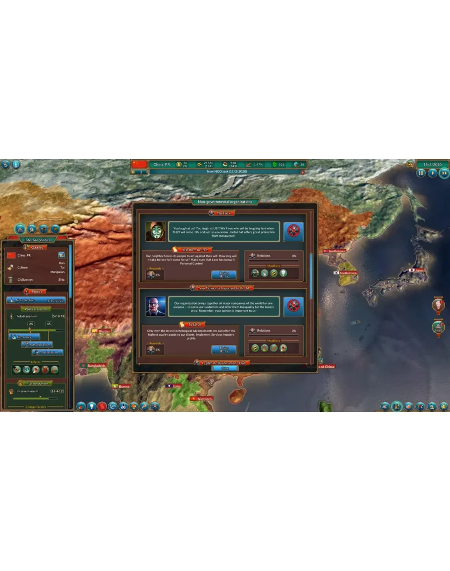 Почувствуйте реальную власть, которая влияет на решения правительства. Тайно сотрудничайте с мафией, поддерживайте крупные корпорации, предоставляя им субсидии и возможности для расширения бизнеса, поддерживайте хорошие взаимоотношения с сепаратистами или приведите страну к гармонии с помощью религии. Вы сможете разными способами управлять внутренними делами страны и международными отношениями, но не забывайте поглядывать на показатели. Примите вызов всех заинтересованных сторон, которые появляются в игре Realpolitiks с дополнением New Power.