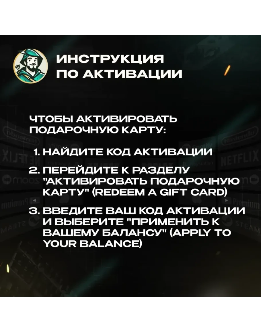 Мы настоятельно не рекомендуем использовать подарочные карты на новых аккаунтах до тех пор, пока вы не добавите в свои способы оплаты действующую банковскую карту. Это поможет избежать возможных проблем с активацией и использованием средств.