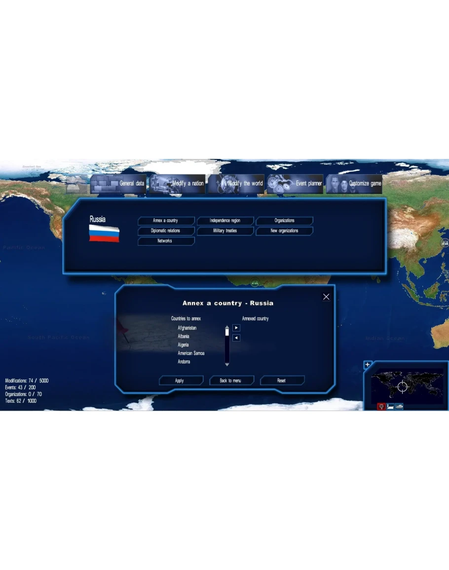 изменять географию мира (объединять страны, делать регионы независимыми, наносить на карту новый город...)