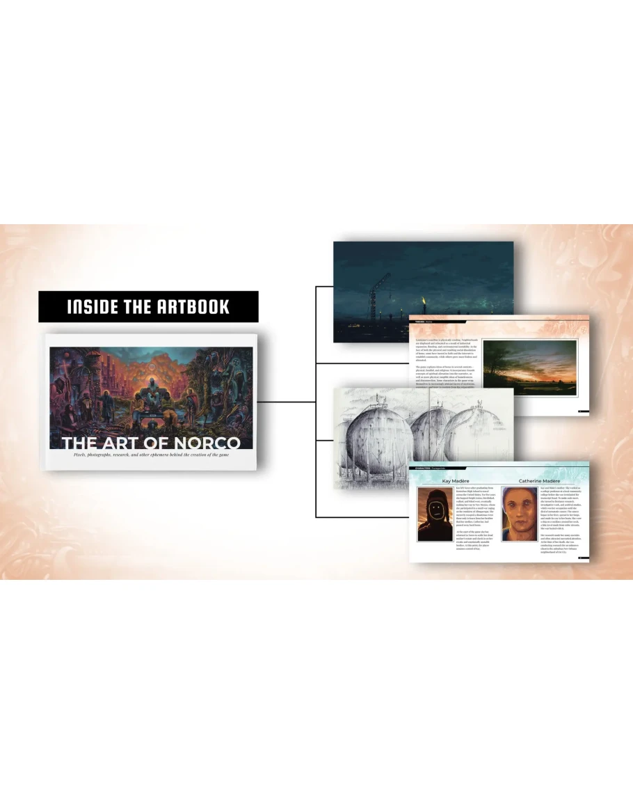 The Art of NORCO – это цифровой артбук, куда вошли более 90 страниц с классическим и пиксельным артом из игры, фотографии, бэкграунд-информация и другие материалы, созданные или собранные разработчиками NORCO. На примере концепт-скетчей и проработанных пиксельных артов разработчики покажут вам, как высыхающие болота, лабиринты нефтеперерабатывающих заводов и другие индустриальные и природные достопримечательности луизианского города Норко нашли свое отражение в мире игры.