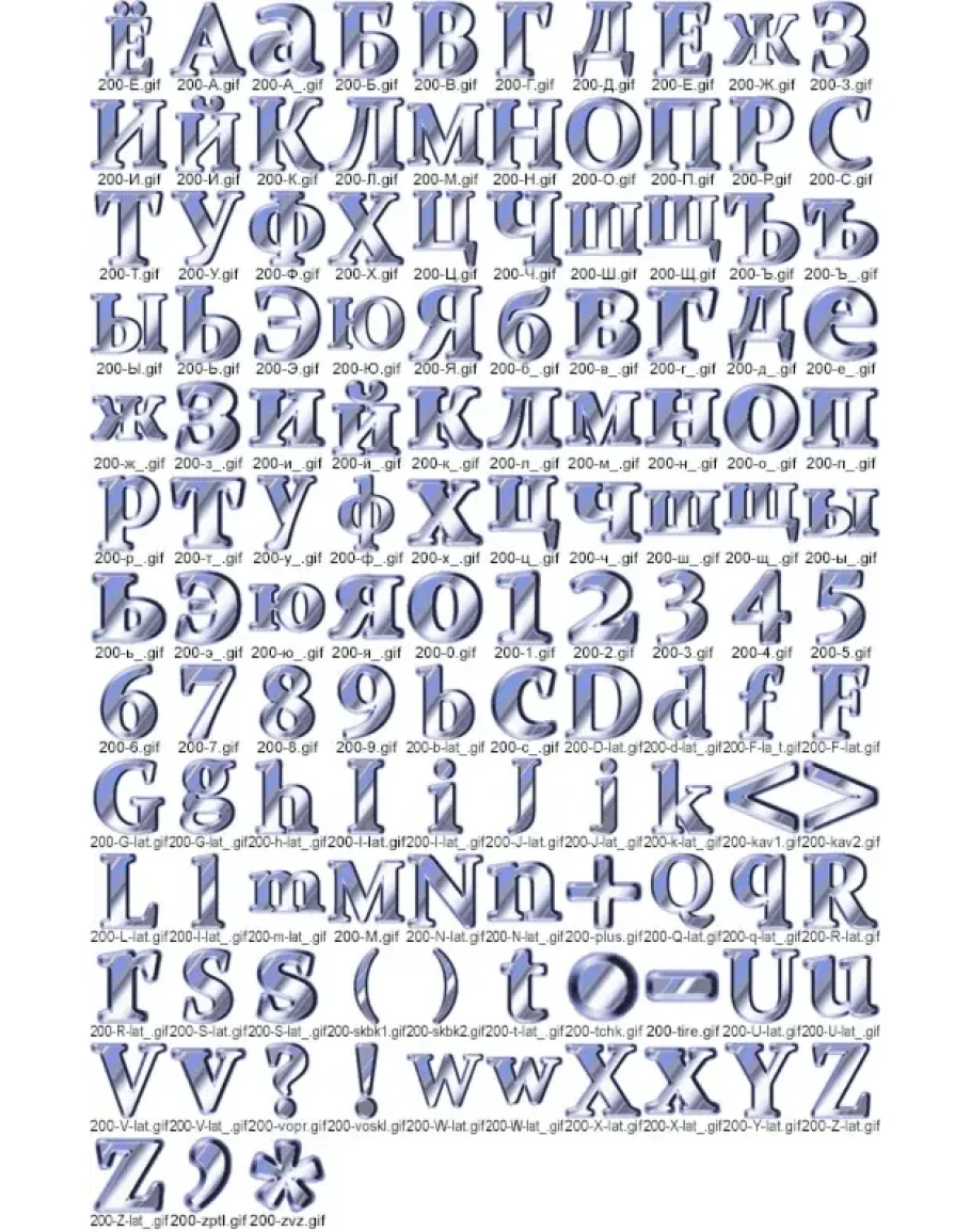 Анимированные "стальные" буквы русского и латинского алфавита, прописные и строчные, цифры и знаки препинания. Для сайтов и презентаций. Буквы, переливающиеся серебристым блеском. В архиве четыре набора по 123 файла (каждый знак в отдельном файле), 200 точек по высоте, 150, 100 и 75 точек в высоту с учетом междустрочного расстояния. Анимированные файлы gif. Фон букв прозрачый. Рассчитано на светлый тон страницы. Для просмотра примера анимации щелкните на рисунок.