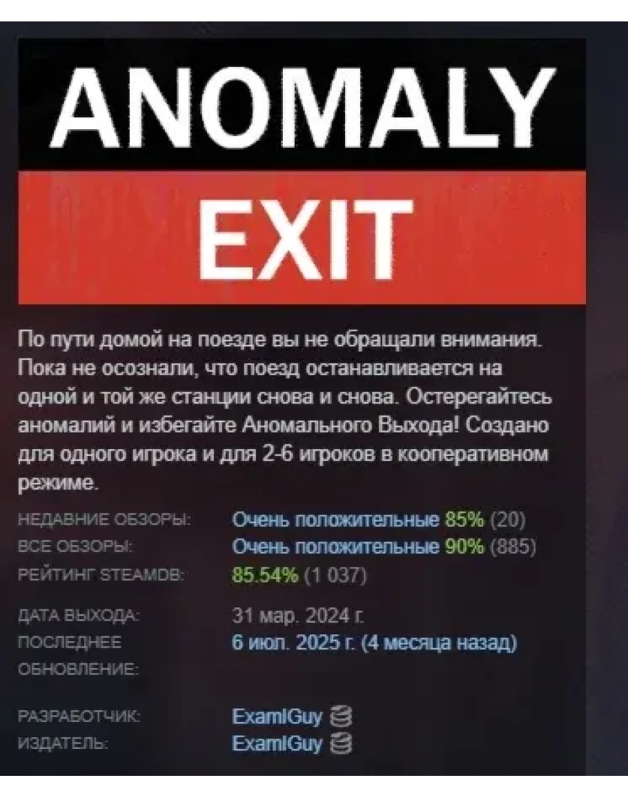 По пути домой на поезде вы не обращали внимания. Пока не осознали, что поезд останавливается на одной и той же станции снова и снова. Остерегайтесь аномалий и избегайте Аномального Выхода! Создано для одного игрока и для 2-6 игроков в кооперативном режиме.