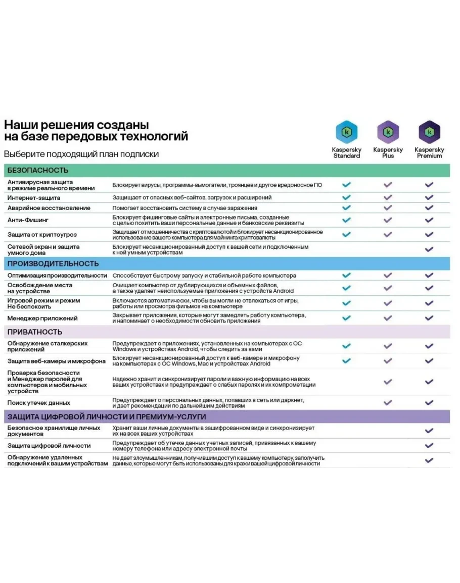 Kaspersky Plus обеспечивает полную безопасность, высокую производительность и конфиденциальность. Решение предоставляет полный набор функций для защиты конфиденциальности: безопасность данных и онлайн-платежей, надежное управление паролями, обнаружение несанкционированного подключения к сети Wi-Fi, а также защиту от звонков спамеров и мошенников. Решение работает на ОС Windows и macOS, а также на Android и iOS-устройствах. Для использования решения требуется учетная запись My Kaspersky.