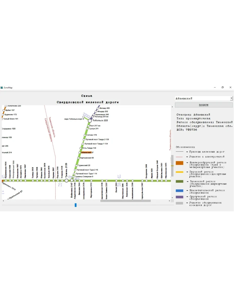 Программа RWMap позволяет найти конкретную железнодорожную станцию на карте Свердловской железной дороги с выводом справочной информации.